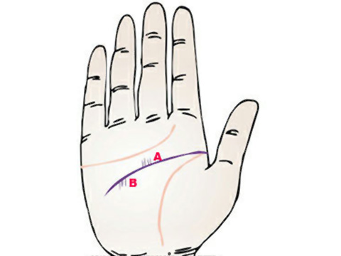 智慧线上出现不少条向上的短支线,此必是富有向上之心(如图中A处),相反的,若出现不少向下短支线(如图中B处),此人缺乏勇气,容易自怨自艾。